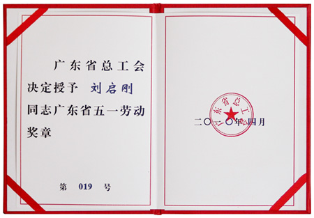 广东省委、省政府授予刘启刚同志广东省五一劳动奖章证书